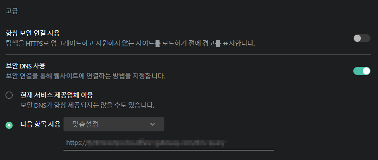 - Cloudflare Zero trust 사용: 설정 → 개인정보 보호 → 보안 → 고급 → 보안 DNS 사용 → 다음 항목 사용 (맞춤 설정) → DNS over HTTPS 주소 붙여넣기