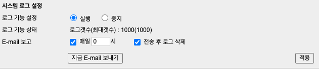 관리자 E-mail 설정이 완료되었다면, 시스템 로그에 '지금 E-mail 보내기' 버튼이 생기고, 버튼을 눌러 정상적으로 메일이 발송되는지 확인할 수 있습니다. 만약, 메일 발송에 실패한다면, 시스템 로그에 '메일 계정 또는 암호가 잘못되었습니다.' 혹은 '메일 서버와 연결할 수 없습니다.' 와 같은 로그가 남게 됩니다.