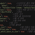 Sublime Text2는 장점으로 꼽히는 다양한 내장함수들을 이용해서 자신만의 코딩환경을 구축할 수 있는데요. 대부분 많이 쓰고있으며 현재 제가 사용하고 있는 설정입니다. 개인 설정은 다음 위치에서 설정하실 수 있습니다. Preferences -> Settings - user 옆에 주석도 달아놨으니 각자 원하는 설정으로 수정해서 사용하세요 = ) 드래그 불가능으로 파일도 올려드립니다. {"bold_folder_labels": true,//사이드바 폴더 라벨"caret_style": "phase",//커서 깜빡임(blink/phase/smooth/solid/wide)"color_scheme": "Packages/Color Scheme - Default/Twilight.tmTheme","fade_fold_..