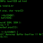 Hackershcool level13 = ) 해커스쿨 FTZ 레벨13 [BOF] 이번 문제는 11, 12번과 역시 같은 구조이지만 변수 i의 값이 0x1234567이 아니라면 메시지 출력 후 프로그램이 종료되어버리는 특징이 있다. 따라서 이번에는 변수 i 부분에는 01234567이라는 값을 넣어주고 나머지 부분은 dummy로 오버플로우 시켜서 ret값에 도달하면 된다. 버퍼1 + \x67\x45\x23\x01 + 버퍼2 + ebp + Ret 과 같은 구조로 코드를 구성해야하기 때문에 변수 i까지의 거리를 구해야한다. 0x080484a0 : push %ebp 0x080484a1 : mov %esp,%ebp 0x080484a3 : sub $0x418,%esp 0x080484a9 : movl $0x123456..